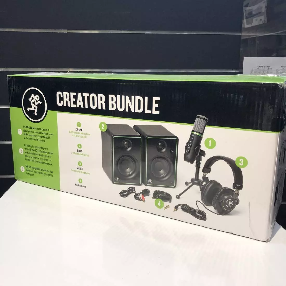 The Mackie Creator Bundle is the ultimate setup for content creators, podcasters, streaming, and beyond. Not only is it perfect for your desk setup, it's extremely easy to take on the go. The EM-USB Microphone connects directly to your computer via high-speed USB-C and captures everything with perfect detail, no EQ required. You also get 2 professional ways of monitoring for both live production and editing. MC-100 headphones provide the clear sound and noise isolation you need to be on point. For editing or just hanging out, our much-loved CR3-X monitors deliver professional studio-quality sound so you can be sure that your viewers or listeners will get a well-balanced mix.