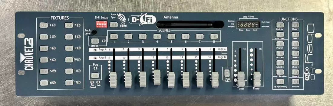 The Obey 40 D-Fi 2.4 is a small but full-featured lighting controller with a built-in D-Fi transmitter so you can built a rig without long DMX cable runs. The Obey 40 D-Fi 2.4 works with any D-Fi compatible product and controls up 12 different types of lights. It stores scenes and chases for playback, and it operates lights "on the fly". The stored scenes and chases are triggered by sound, or manually adjusted, to get just the right speed and fade time for your look. The Obey 40 D-Fi 2.4 is MIDI compatible and has dedicated fog and strobe controls.