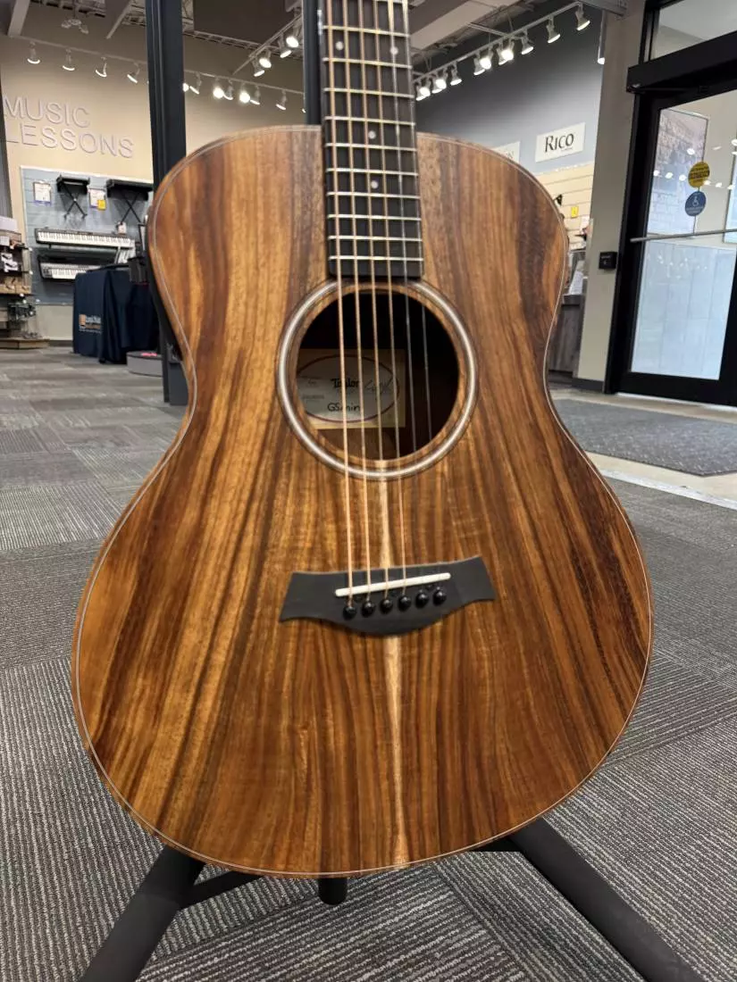 This alluring all-koa version of the GS Mini pairs a solid koa top with layered koa back and sides, serving up an inspiring blend of looks, feel and sound. The compact Mini's scaled-down design delivers ultra-portability for players on the go and couch-friendly comfort for picking at home, while the rich, bold sound punches well above its weight for a smaller guitar. The patented neck design guarantees signature Taylor playability, and the shorter 23.5-inch scale length makes forming a chord a breeze. The built-in ES-B pickup offers clear, natural amplified tone and includes a digital tuner with an easy-to-read LED display. The GS Mini-e Koa ships with a structured gig bag.