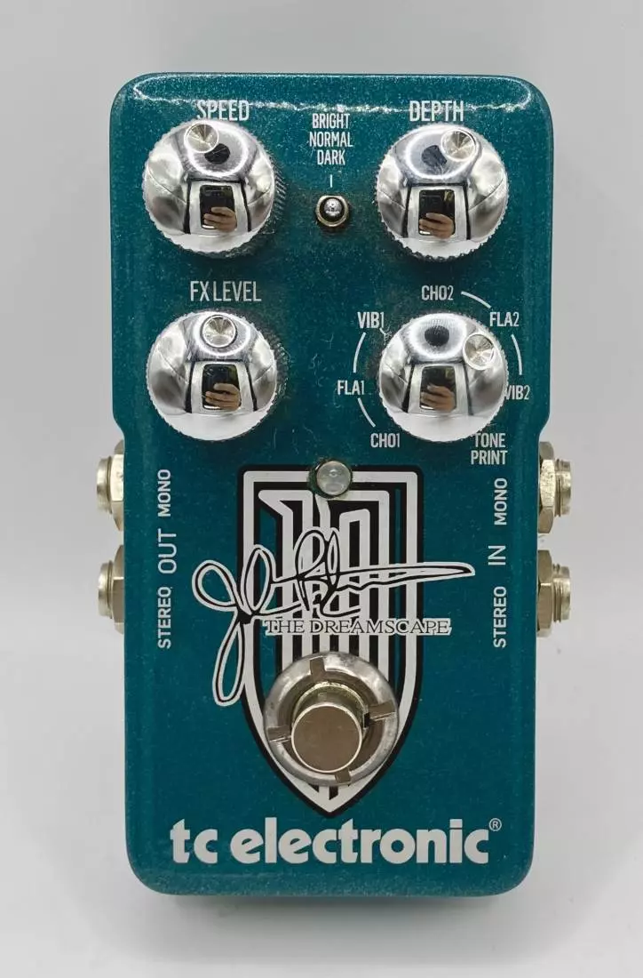 The Dreamscape has four knobs: Speed, Depth, FX Level and one that chooses between the six integrated signature tones and an additional TonePrint. Further, the pedal has a three-way switch that lets you toggle between Bright, Normal and Dark, which is an overall tonal shaping feature chosen by John. Finally, The Dreamscape gives you all of the great features included in other TonePrint pedals do such as true bypass, one-screw-battery-access and a sturdy design made for life on the road.
