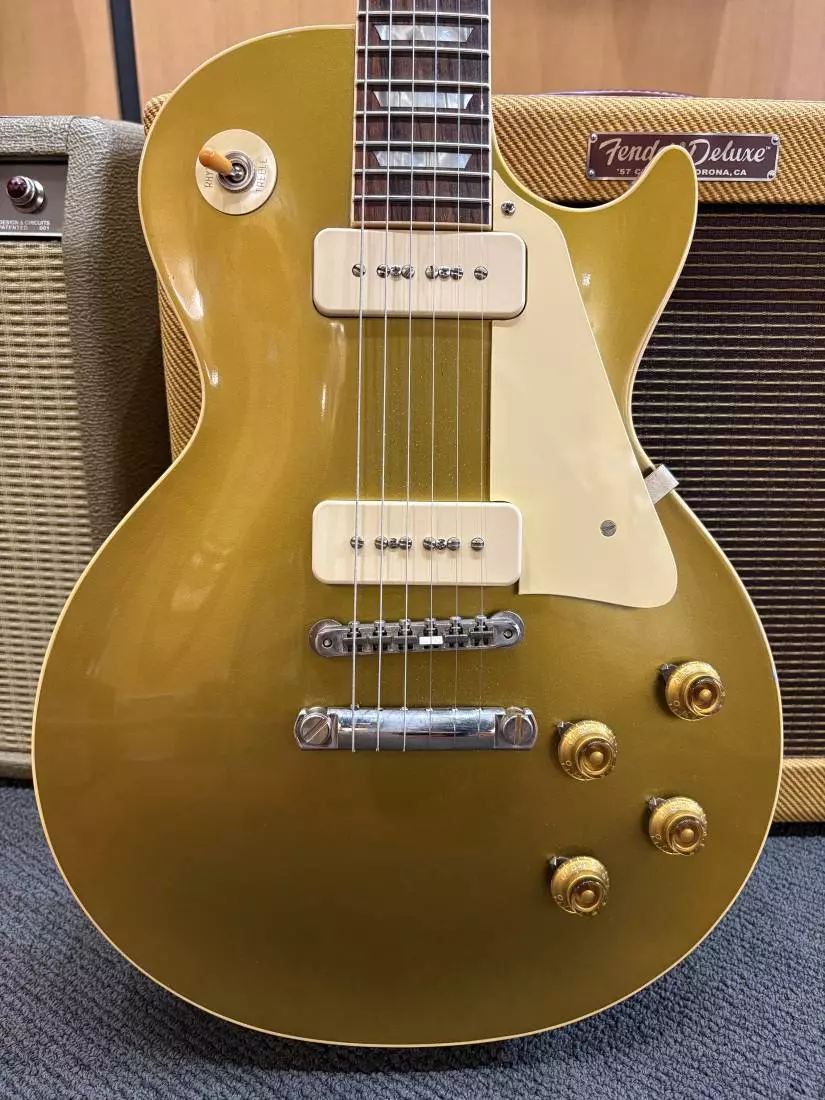 1956 was the only full year in which the Les Paul model featured the powerful P-90 pickups and the adjustable ABR-1 bridge setup, a combination that allowed the Les Paul model to intonate, sustain, and thrill like never before. This Gibson Custom Shop '56 Reissue captures the look, feel and searing sound of an original 1956 Les Paul Goldtop in exhaustive detail, featuring all solid woods, vintage-accurate gold paint, authentic replica parts, Historic narrow/tall frets, and hot hide glue construction.