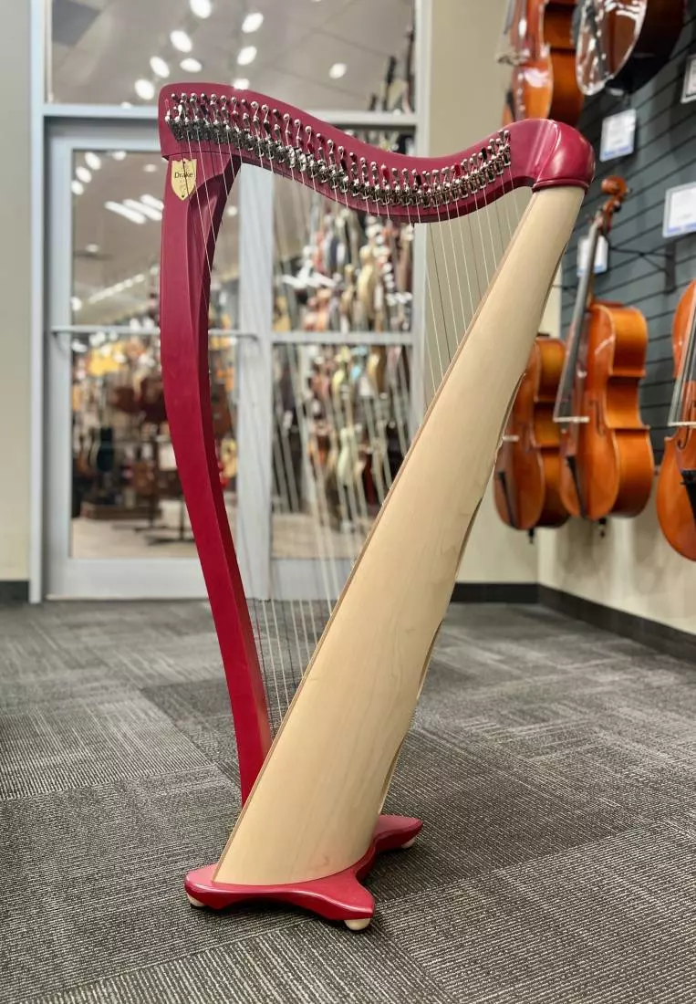 The Drake is Lyon & Healy's new light-tension 34-string lever harp. Its bright and clear yet resonant sound offers an inspiring playing experience for the beginner of any age. The Drake is strung with the new-to-market BioCarbon® Strings, made using a blend of a recently discovered bio-plastic derived from sugar-cane; the sound of these strings delivers a powerful tone that provides superior acoustic projection and sustain. Comes with 8" (20 cm) legs.