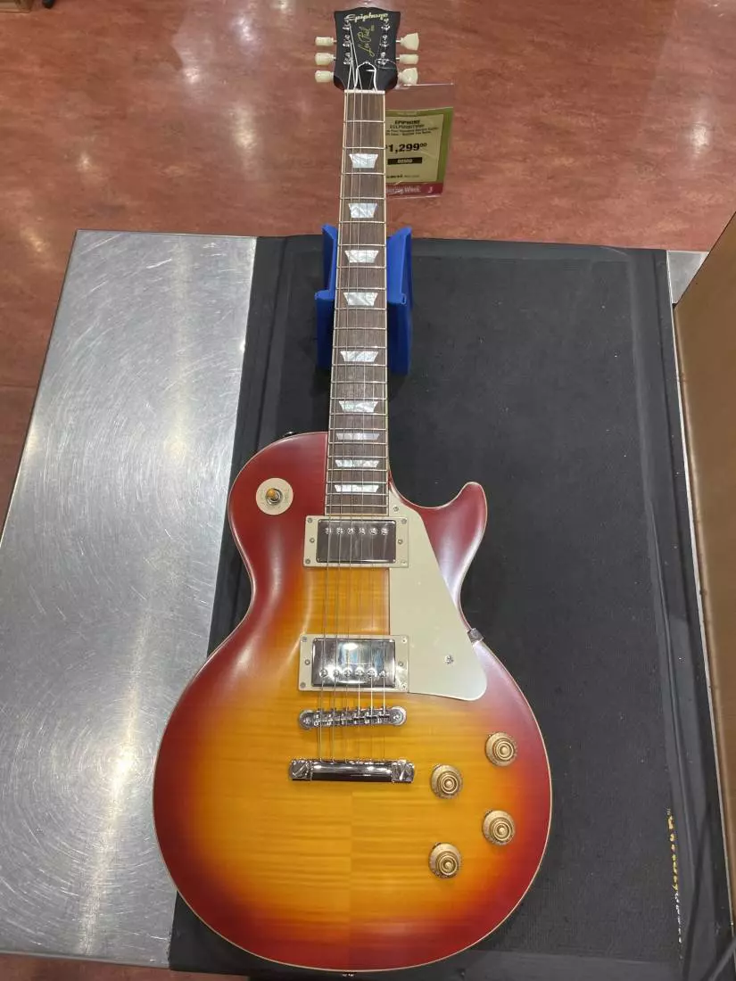 Made in collaboration with Gibson™ Custom, the Epiphone 1959 Les Paul™ Standard is Epiphone's incredible recreation of the rare vintage classic, updated to be more authentic and true to the originals than ever. It features a mahogany body with a maple top with a AAA flame maple veneer, a one-piece mahogany neck with a comfortable '59 rounded, medium C profile, long neck tenon, and Gibson-style "open book" R9 headstock shape, VOS (Vintage Original Sheen) finish, Gibson Custombucker humbucking pickups, Switchcraft® selector switch and 1/4" output jack, CTS® pots, 50s era wiring, Mallory™ capacitors, non-beveled pickguard, Epiphone Deluxe vintage tuners with Keystone buttons, and a vintage-style brown and pink hardshell case. Play one today, and prepare to be amazed!