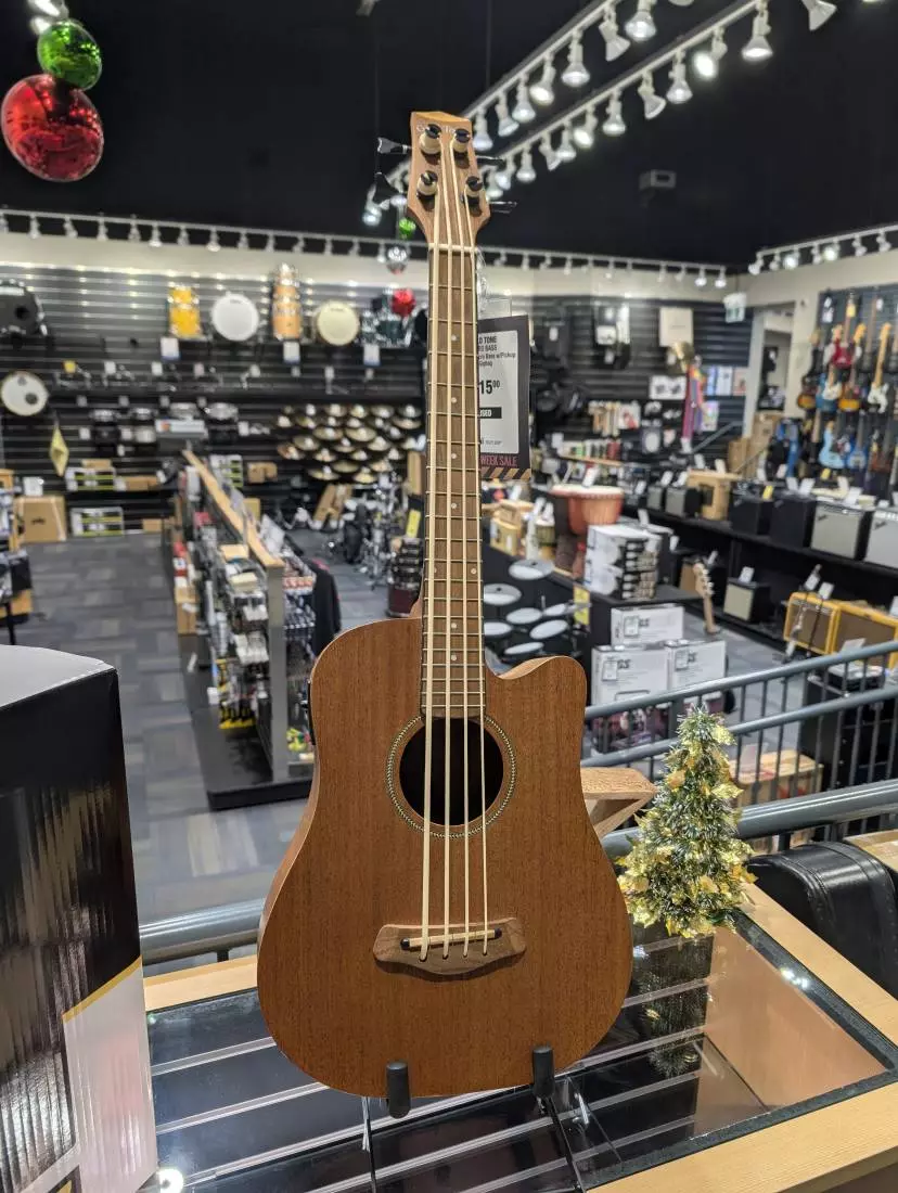 The MicroBass, or M-Bass, is a 23" short-scaled acoustic/electric bass guitar that utilizes a dedicated synthetic string made by the Aquila company and a piezo transducer pickup that deceivingly packs far more of a wallop than what meets the eye. The extended scale length greatly improves intonation over similar models and allows for an acoustic volume loud enough to enjoy without plugging into an amplifier. The sloped ergo-glide top makes this instrument extremely comfortable to hold.