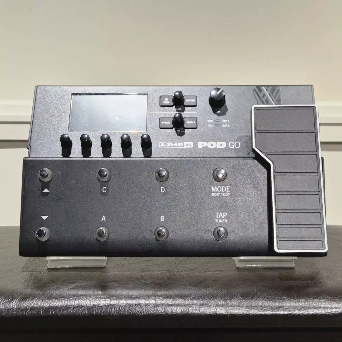 POD Go enables a simple and intuitive workflow. Choose, edit, and control sounds using the large color LCD screen, five push encoders, eight rugged footswitches, and cast-aluminum multi-function expression pedaland add two external footswitches or a second expression pedal for even more real-time control. All the essential audio connections are at your fingertips, too, including balanced stereo outputs, a duplicate amp out that can be tapped before the Cab/IR, a stereo effects loop, a headphone jack, and even a USB port for accessing the 4-in/4-out audio interface with re-amping.