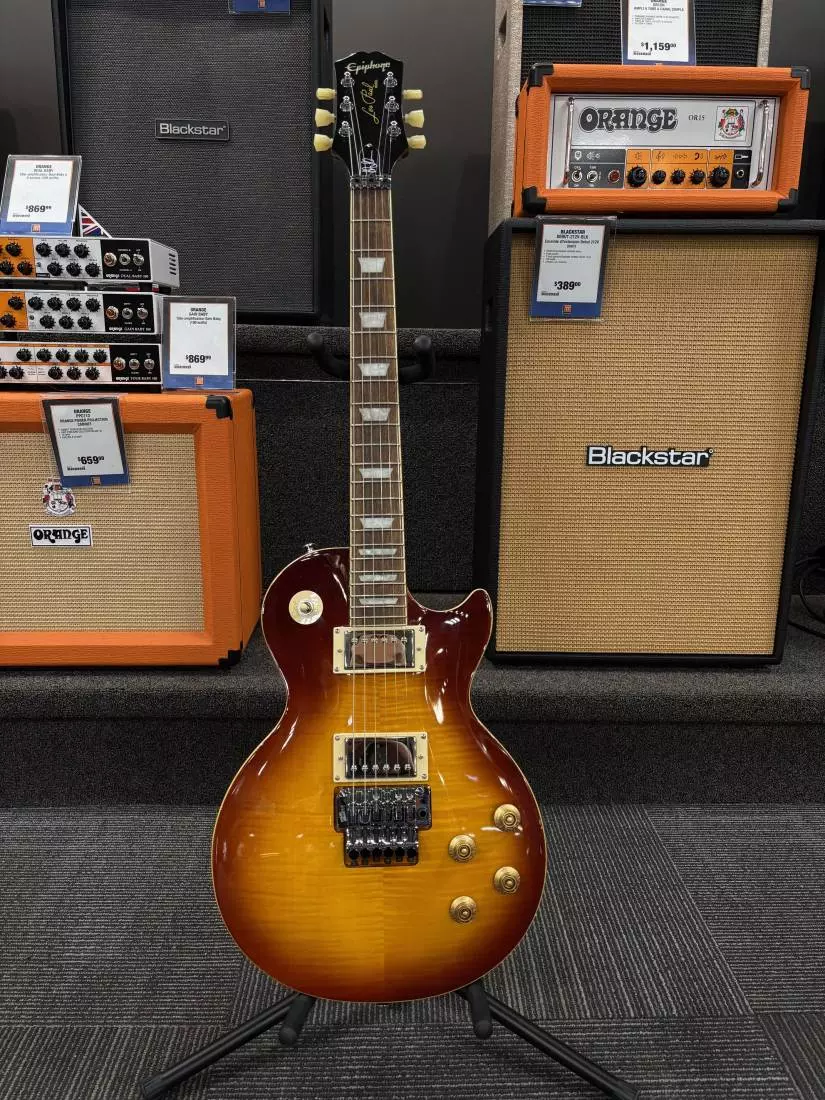 The Alex Lifeson Les Paul Axcess Standard carries powerful Epiphone Ceramic Pro neck and ProBucker 3 bridge pickups with mcoil-splitting options via their push-pull volume controls and a Graph Tech Ghost Floyd Rose system that not only provides the world's most efficient vibrato but is also loaded with Ghost piezo bridge saddles. Access traditional magnetic humbucker tones, mix it up with coil-split options, tap the Ghost's realistic acoustic tones, or blend acoustic and magnetic voices - the sky's the limit from this sonic chameleon, whose sound-shifting depths are virtually limitless. You can route it all through a traditional mono jack or use two cables for individual magnetic and piezo outputs. All this and the Alex Lifeson Les Paul Axcess Standard still presents that timeless Les Paul look that has remained a classic for more than 60 years. An EpiLite™ case is also included.
