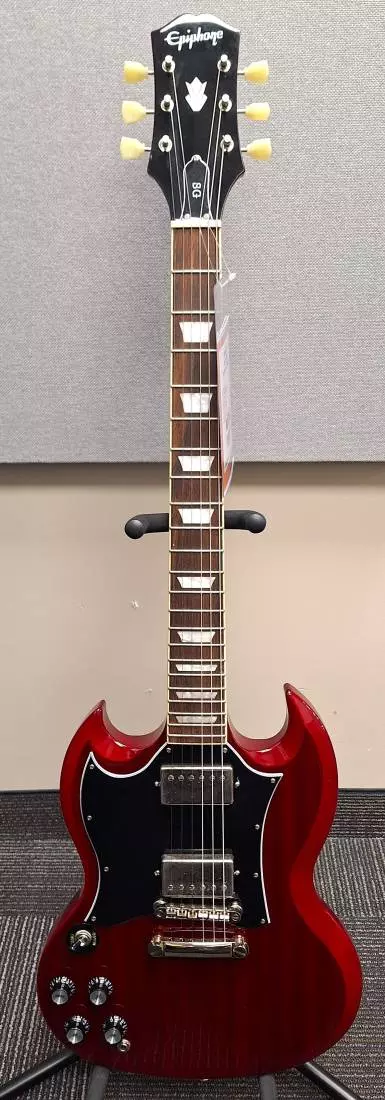 The Epiphone SG Standard from the new Inspired by Gibson Collection, recreates the legendary 1960s classic that powered the first generation of hard rock and heavy metal bands including The Who, Cream, AC/DC, and Black Sabbath. The guitar features the historic SG profile with "batwing" pickguard, a pair of Epiphone's Alnico Classic PRO™ humbuckers, and 18:1 ratio Epiphone Deluxe Tuners. This Epiphone Inspired by Gibson Original model also has the Kalamazoo headstock, rolled neck for a comfortable feel, GraphTech® NuBone™ nut, era-appropriate wiring, and CTS pots.