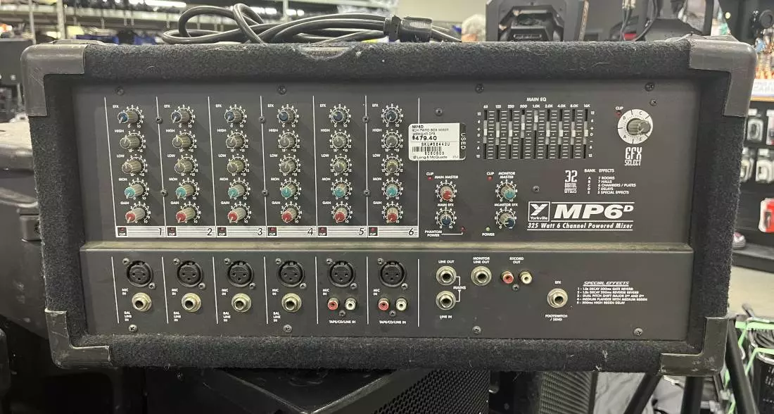 The MP6D six channel powered mixer solves problems! 325 Watts at 4 Ohms means that you get better than 160 Watts of power to each of your 8-ohm speakers. This means more power where you need it! The 32-preset footswitchable digital effects processor has more than just basic reverb. Effects include seven rooms, seven halls, six chambers and plates, seven delays and five special effects!! Pick the effects that works best for you.