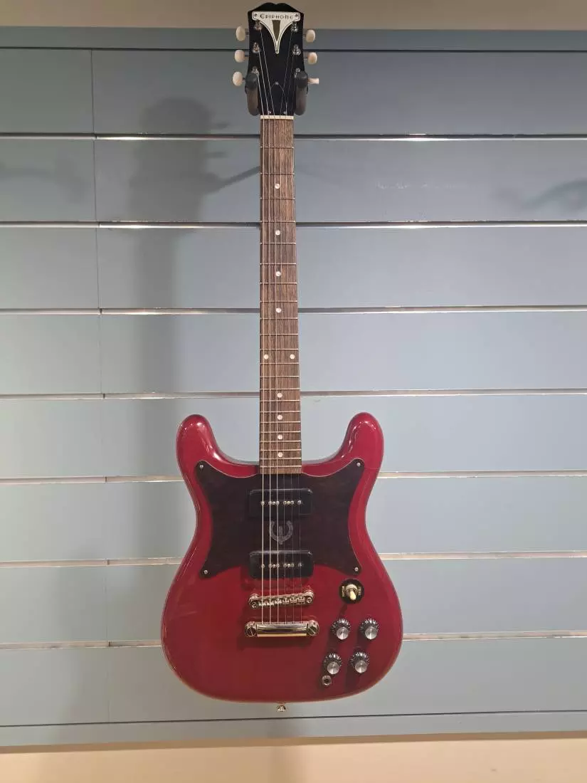From its first appearance in 1959 the Wilshire has been one of Epiphone's most successful original solid body electric guitar designs. The Wilshire P-90 brings back many of the features of the earliest Wilshire models including the symmetrical double-cutaway mahogany body with dual PRO P-90 Soapbar pickups, three on a side reduced sized Kalamazoo headstock with Epiphone Bikini badge and ivory button Epiphone Deluxe tuning machines, and a butterfly tortoise shell pickguard with foil E logo. The Wilshire P-90 comes equipped with a glued-in mahogany neck with a medium C profile, Indian laurel fretboard with 12" radius and 22 medium jumbo frets, 2 volume and 2 tone controls and an Epiphone LockTone Tune-O-Matic bridge and Stop Bar tailpiece, and is available in classic Cherry and Ebony finishes.