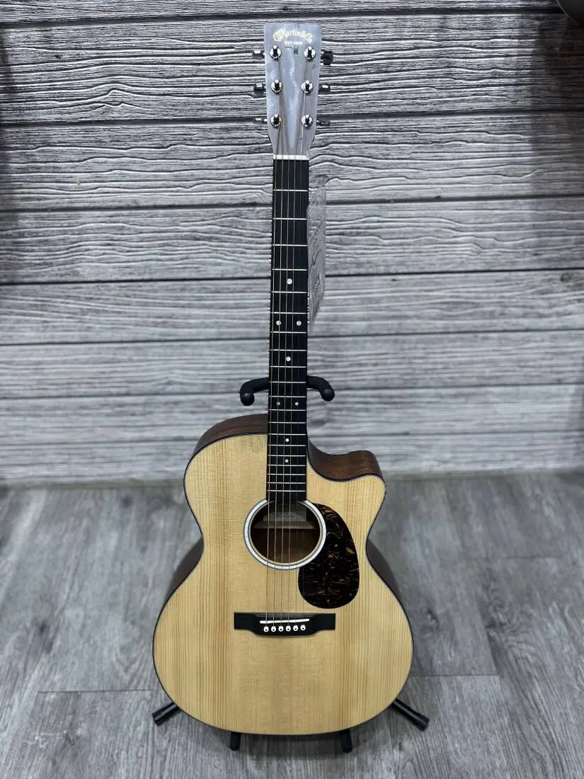 With a gorgeous glossed Spruce top and sapele back and sides, this solid wood Grand Performance model with cutaway is a great sounding guitar at an affordable price. New to this model are stunning mother-of-pearl pattern fingerboard and rosette inlays with a multi-stripe rosette border. It has an FSC Certified Richlite fingerboard and bridge, satin finish body, and a hand-rubbed neck finish. Also new to this model is the Martin E-1 electronics package with a built-in soundhole tuner that auto mutes the audio output so you can tune up any time without using a pedal. This guitar comes with a Premium Soft Shell Case so it is Road-ready to join you on all of your adventures!