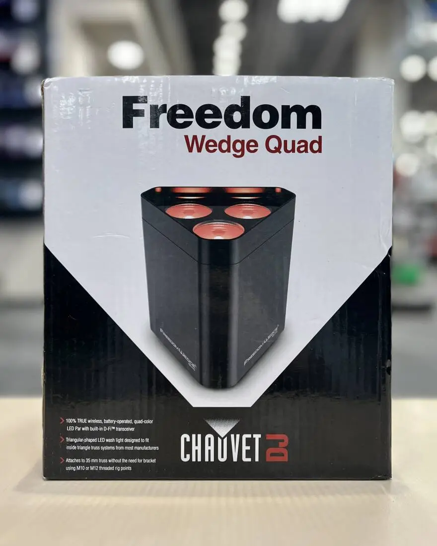 The Freedom family of CHAUVET DJ fixtures means 100% TRUE wireless, battery-operated products with built-in D-Fi™ transceivers to send and receive wireless DMX signals. Freedom Wedge Quad harnesses that power into a triangularly shaped quad-colour LED wash light designed to fit inside triangular truss systems. The light has a built-in adjustable leg to shine light where it's needed, and Freedom Wedge Quad can be attached to 35 mm truss without the need for brackets using M10 or M12 threaded rig points. Create any colour without DMX by using the built-in digital display or easily control static colours and automated programs with the included IRC-6 remote. Freedom Wedge Quad features built-in dimming curves for smooth dimming and its flicker-free output is perfect for on-camera use. Create coordinated light shows by linking other quad-colour LED fixtures in Master/Slave mode.