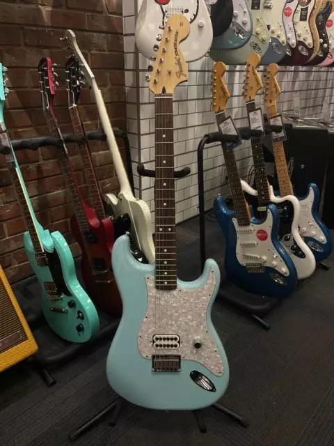 The Tom DeLonge Stratocaster boasts a Seymour Duncan® Invader™ humbucker for immense output and turbo-charged tone that's perfect for chunky power chords and crunchy riffs. But it's not all about power - the streamlined control setup consisting of a single master volume combined with a treble bleed circuit preserves the guitar's natural high-end, ensuring sparkly cleans and chime-y edge-of-breakup tones. The comfy modern "C" neck features medium jumbo frets on a 9.5" radius rosewood fingerboard for a modern feel with superior playability. Other highlights include vintage-style tuners and hardtail Stratocaster bridge with block saddles for classic looks, superior intonation and enhanced tuning stability. A custom crafted Tom DeLonge neck plate is decorated with DeLonge's original artwork.
