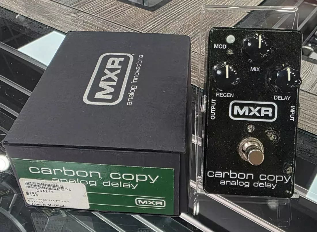 The MXR Carbon Copy Analog Delay Pedal features a completely analog audio path for the ultimate in rich, warm delay-made possible only by old-school bucket brigade technology. This design boasts an amazing 600ms of delay time with optional modulation via a top-mounted switch and a simple, three-knob layout that controls Delay time, Mix (dry/wet blend), and Regen (delay repeats)-all in a pedal no bigger than a Phase 90. In addition, the M169 pedal has two internal trim pots that offer user-adjustable width and rate control of the modulation for even more tonal options. The Carbon Copy effect pedal will take you from crisp "bathroom" slap echoes to epic, Gilmour-esque delays with a twist of a knob. True hard-wire bypass, single 9-volt operation, and stage-ready blue LEDs round out the package.