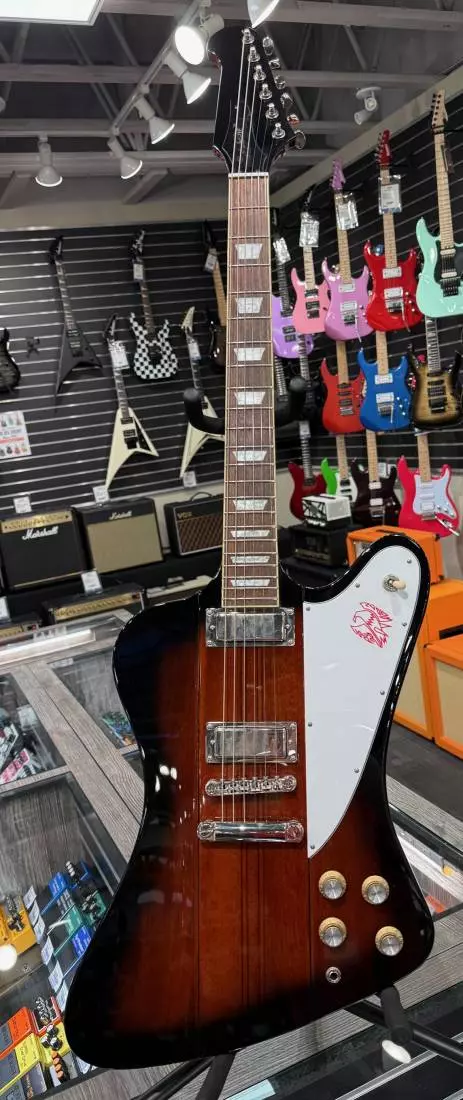 The Epiphone Firebird from the Inspired by Gibson Collection recreates the classic Firebird as it was first produced in 1963. Featuring a Mahogany body in a Vintage Sunburst finish, Grover® 18:1 ratio mini tuners, and powered by Epiphone ProBucker™ humbuckers with CTS electronics.