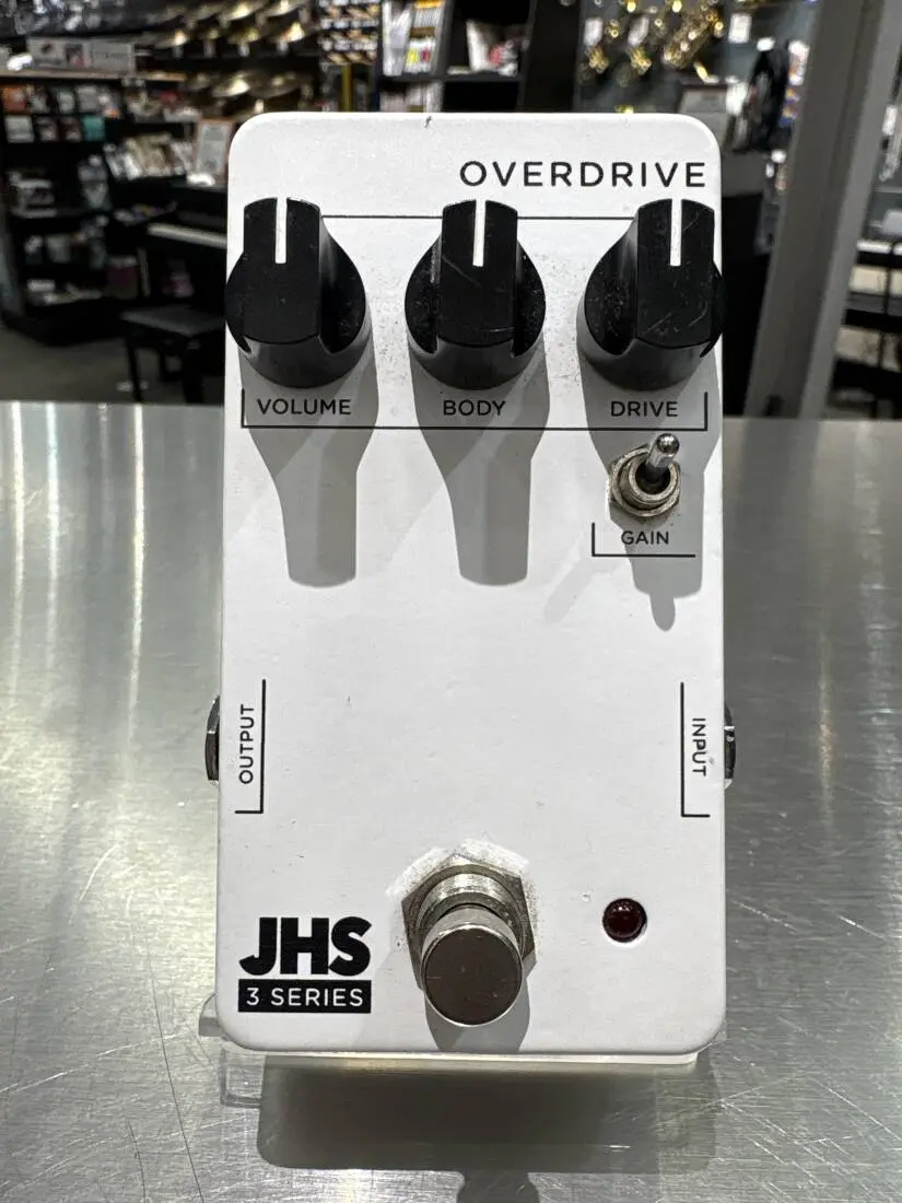 The JHS Pedals 3 Series Overdrive offers a wide range of overdrive sounds - anything from boost and transparent low gain, to huge amp-like medium overdrive sounds. The simple knob functions give you control over the Volume, Body (or EQ), and Drive. The Gain toggle gives you a choice between more saturated and compressed or more open and crunchy dynamics. This switch plays a big part in how the pedal responds to your playing and touch as a player.