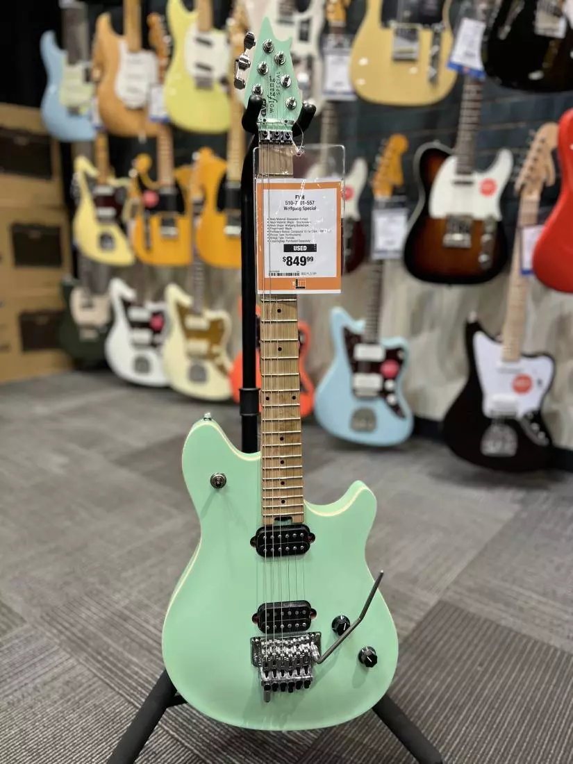 A pair of flagship custom designed black EVH® Wolfgang Alnico 2 humbucking pickups are mounted directly to the body, providing dynamic yet articulate voicing, as well as endless sustain for powerful chords and melody lines. A sturdy and dependable EVH-branded Floyd Rose® locking trem and Floyd Rose locking nut work in tandem for precise tuning even with extreme changes in pitch, while the EVH D-Tuna® retunes to drop-D and back with strict accuracy at the flick of a finger. The volume knob with treble bleed circuit has a 500K EVH Bourns® low friction pot for smooth swells and a tone control knob with a 250K Bourns high friction tone pot that prevents accidental tone shifting. Spotlight-ready, the Wolfgang Special is now available in an all-new Satin Surf Green finish with cream body binding, color matched headstock and chrome hardware.