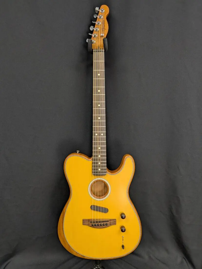 The evolution of Fender's trailblazing Acoustasonic platform continues with the introduction of the Acoustasonic Player Telecaster. This acoustic-electric guitar offers its own set of six voices that showcases its unique personality. A streamlined 3-way switch allows for shape-shifting between acoustic and electric tones. With the Acoustasonic Player Telecaster, this platform has been refined to offer a versatile, more accessible tool for the modern musician.