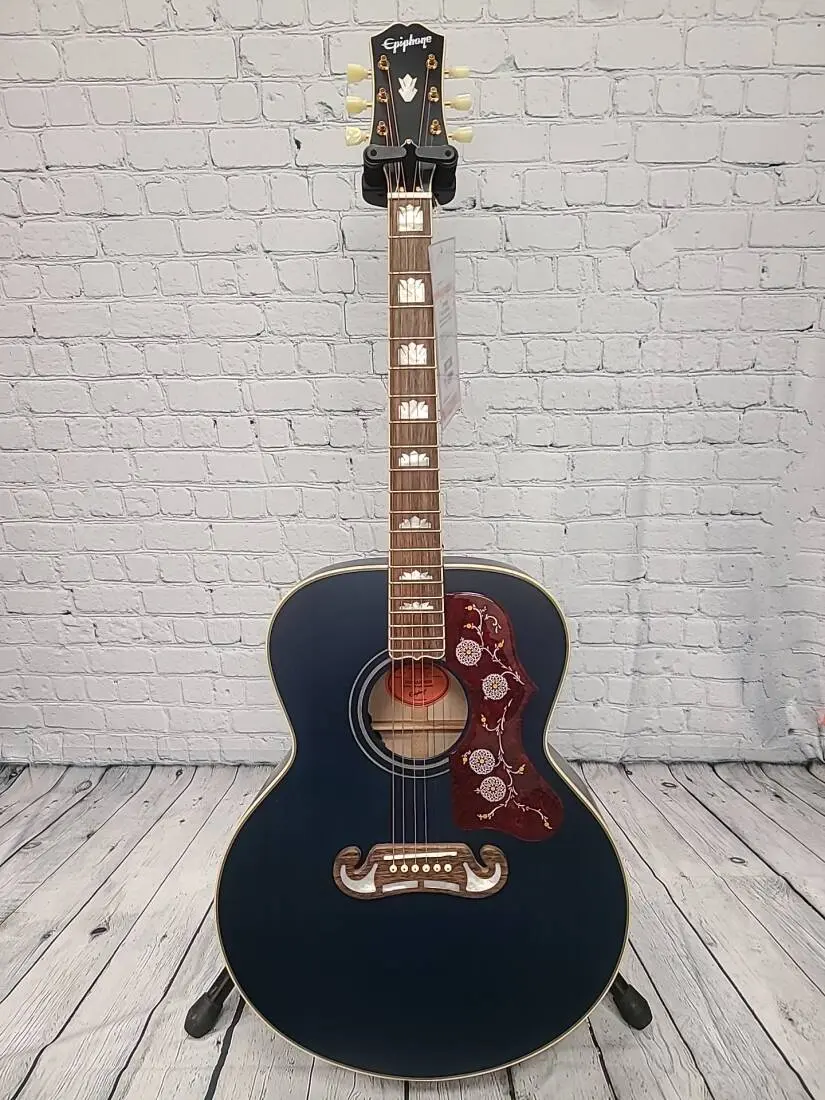 Time-honored for its beauty and huge tonal range, the Super Jumbo remains at the top in this general category. This Epiphone Limited Edition features solid figured maple back & rims, a Sitka Spruce top, a comfy, robust, "C" contoured 3-piece Maple/Mahogany neck, an Indian Laurel fretboard with inlaid Mother-of-pearl Crown markers, 6-ply Binding, a Fishman Sonicore pickup system and Gold-plated Epiphone Deluxe tuners.