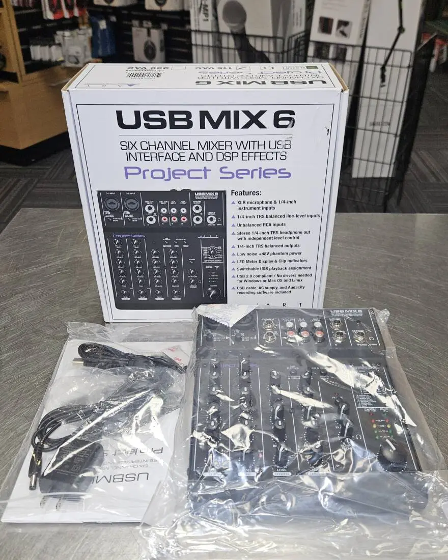The ART USBMIX6 Microphone, Instrument, and Line Mixer / Computer Interface is a compact versatile audio interface for your computer that converts analog signals from a variety of audio sources to a digital audio. The built-in low latency stereo digital effects add to the versatility. It can also be used as a standalone mixer through the main mix outputs. The USBMIX6 provides a great starting point for personal home studio recording or for anyone wanting to do mobile location recording. Use the USBMIX6 to record podcasts, capture your latest idea for a song, make voiceovers for your home movies, or record a jam with a friend - whenever and wherever your creativity takes you!