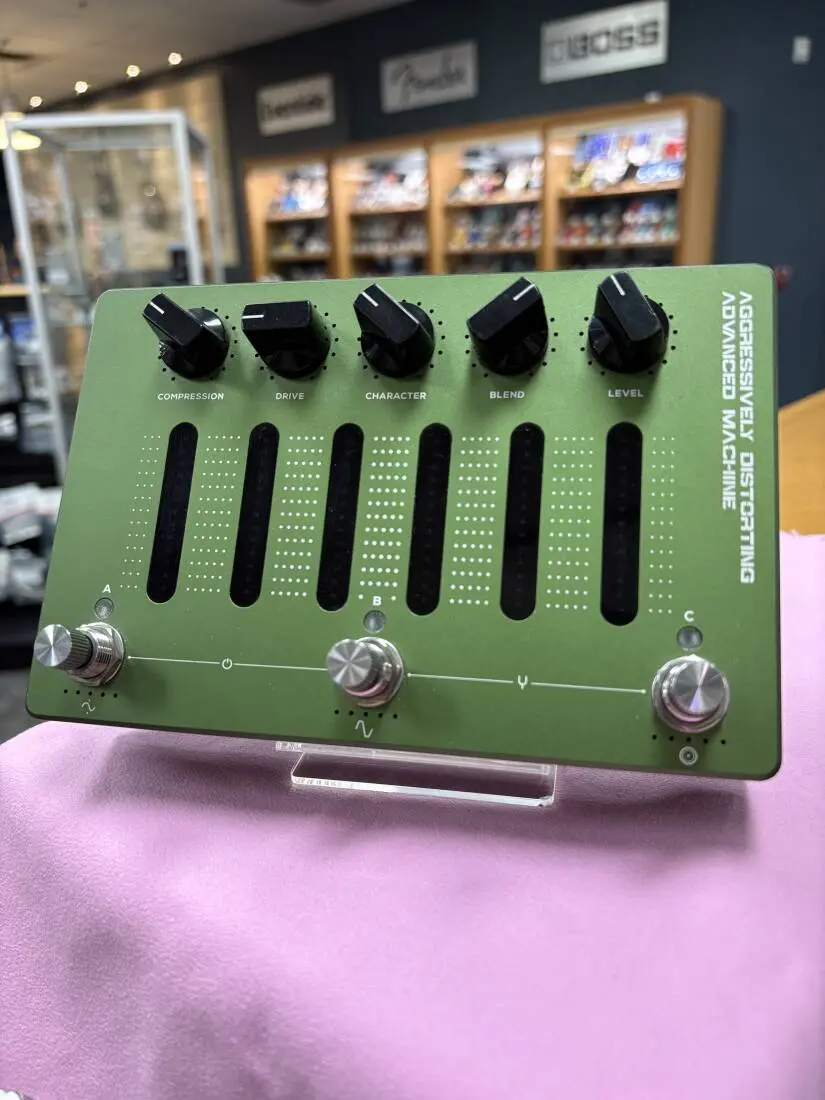 The Aggressively Distorting Advanced Machine has three fully programmable rotating footswitch presets. Each of these stores your unique blend of compression, distortion, impulse responses, EQ parameters, and signal chain settings. Featuring a unique and innovative top-notch precision touch slider interface, for its 6-band programmable EQ.