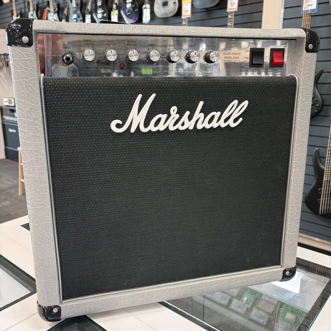 In keeping with true Jubilee tone, the 2525's preamp is identical to the full sized 2555X amp, released in 2015, made using the original diagrams and checked against the original 2555 Silver Jubilee head in the Marshall Museum. The amp also features classic silver vinyl and chrome plated panelling to complete the Jubilee look.