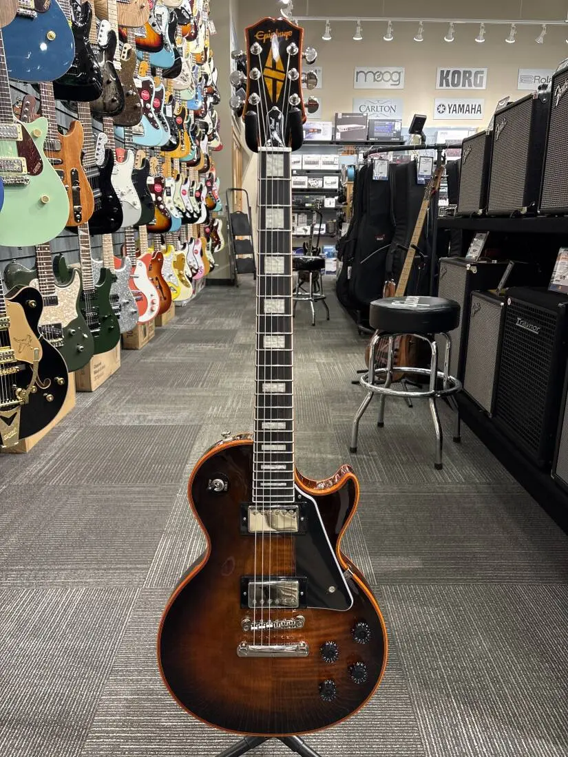 This Epiphone Les Paul Custom Widow electric guitar is a bold reinterpretation of a classic design, offering premium craftsmanship and striking aesthetics. Part of Epiphone's Inspired by Gibson Collection, this guitar features a mahogany body with a flame maple top, delivering rich sustain and articulate brightness. The ebony fingerboard with pearloid block inlays adds visual elegance while ensuring smooth playability. Equipped with ProBucker Custom humbuckers modeled after Gibson Custom's acclaimed pickups, this instrument provides iconic Les Paul tone with dynamic versatility. The Widow's color-matched binding and chrome hardware create a standout look, making this guitar as visually captivating as it is sonically impressive.