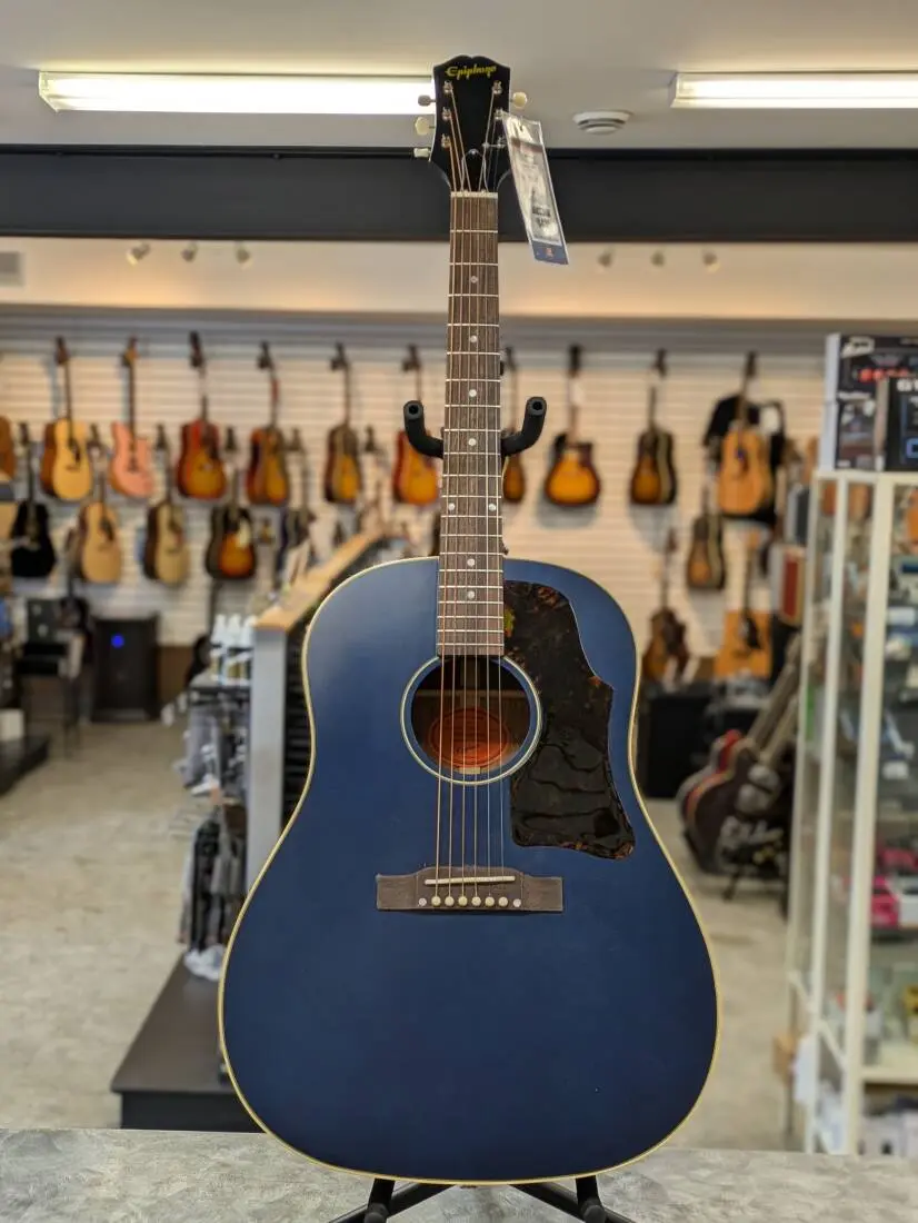 No studio Ace's collection is missing a round-shouldered acoustic like the venerable J-45. It's ability to precisely voice and project every note, then blend them all into powerful chords has made the J-45 a go-to for veterans and aspiring veterans alike. True to tradition, this Limited Edition Viper Blue Epiphone round-shoulder features mahogany back and rims, a Sitka Spruce top, a fast and comfy C-shaped mahogany neck and adds Fishman's Sonicore pickup system.