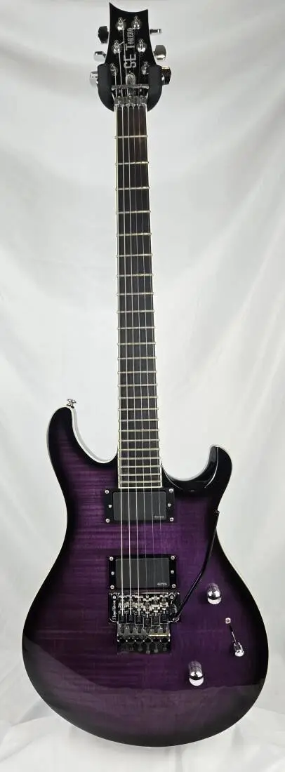 The SE Torero features several firsts for PRS a Floyd Rose bridge, EMG pickups, and neck through body construction among them that should appeal to both the existing PRS player and a new audience and musician. The minimal/unpronounced heel smoothly blends into the body and the deeper, lower cutaway gives easier and smoother accessibility to the upper frets while the pick-ups provide power, clarity, and definition. These features all contribute to the Toreros notable sustain, and the bound ebony fretboard with jumbo frets and no inlays paired with a mahogany body and flame-maple veneer give this guitar a very distinct look.