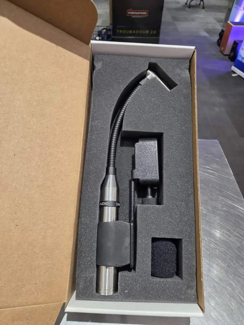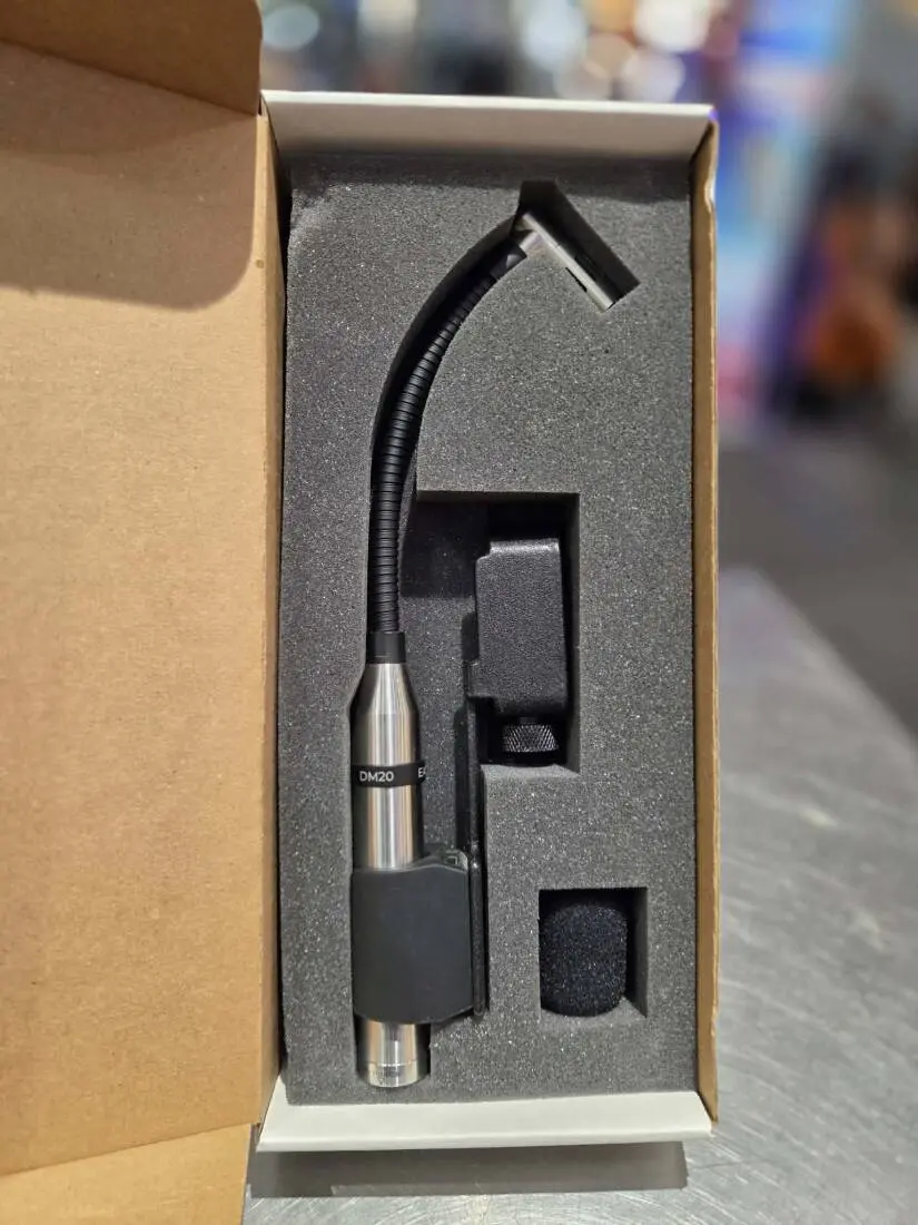 Machined out of stainless steel, the DM20 is capable of withstanding a stray stick hit. A right angle microphone head allows the user to position the microphone precisely, while the stiff yet flexible gooseneck will stay put even with the most energetic drummer.