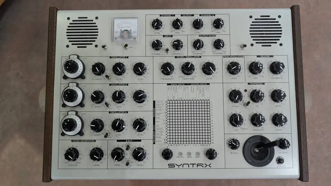 SYNTRX has 3 highly accurate VCOs that track great over 8 octaves, noise generator with “colour” filter, resonant VCF, ring modulator, spring reverb, looping envelope generator, joystick controller, input amplifier with adjustable gain for microphone to line level signals, 3 VCAs, output signal filter, analogue CV/audio signal level indicator and built in speakers. Extra features, not found on Synthi AKS, are Sample & Hold circuit with individual clock, octave switch for VCO1, synchronization of VCO2, AD mode on the envelope generator, as well as MIDI that accepts CV, Gate, Modulation wheel messages and program change messages for the matrix control. The SYNTRX comes in aluminium enclosure with ash tree side panels.