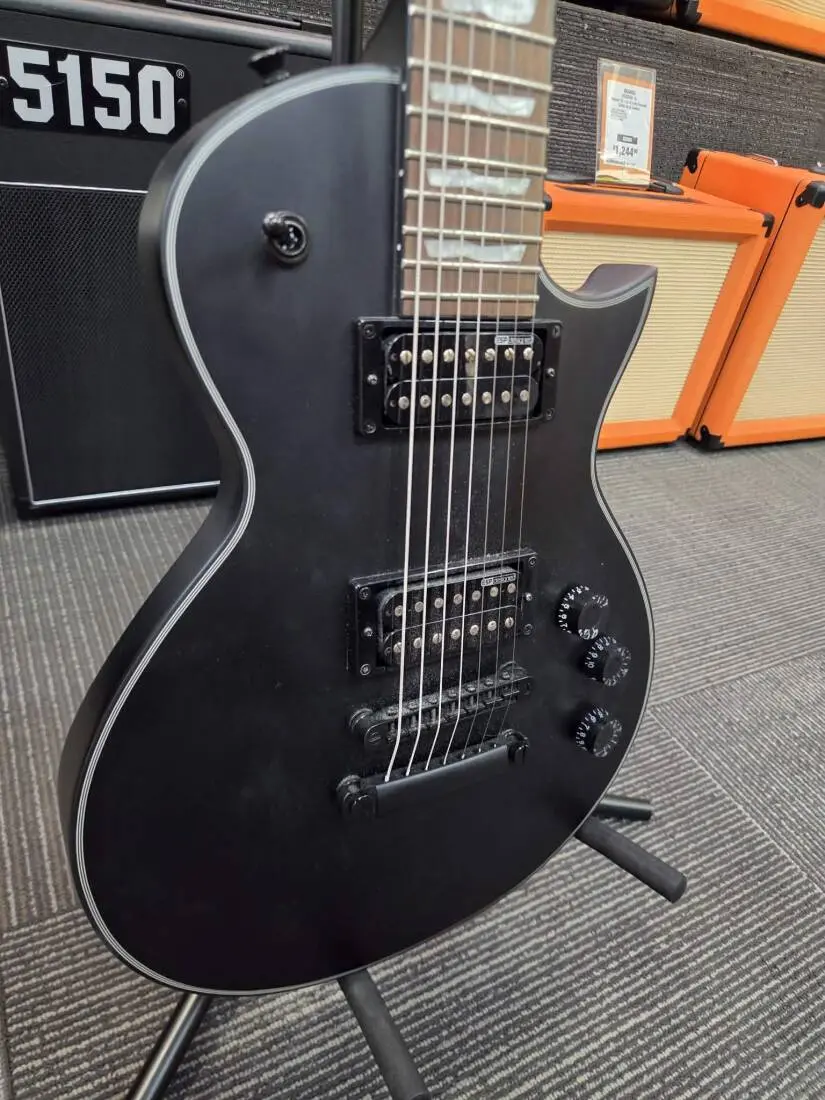 Extended range guitars don't have to cost an arm and a leg to be great. The LTD EC-257 (seven-string) and EC-258 (eight-string) guitars are affordable for just about any musician, and allow you to explore the depths of lower pitches for today's modern sounds. These guitars feature excellent ESP Designed pickups, comfortable mahogany bodies, three-piece mahogany necks, and roasted jatoba fingerboards with 22 extra-jumbo frets. The EC-257 offers a TOM bridge and tailpiece, while the EC-258 features a hardtail design. Both are available in Black Satin finish.