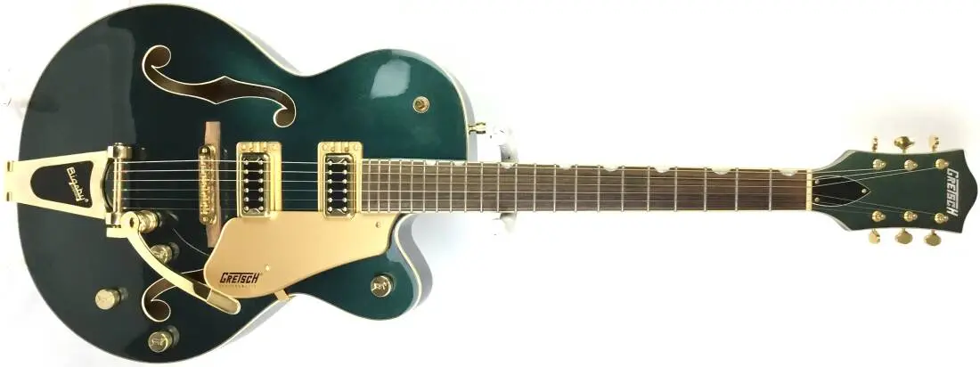 Premium features include: Dual "Black Top" Filter'tron humbucking pickups, Versatile upgraded controls including master volume treble-bleed circuit, Oversized bound F holes and aged multi-plybody binding, Smaller late-'50s G6120 bound headstock, Graph Tech NuBone nut, Pearloid Neo-Classic "thumbnail" fingerboardinlays, Bigsby B60 vibrato tailpiece.