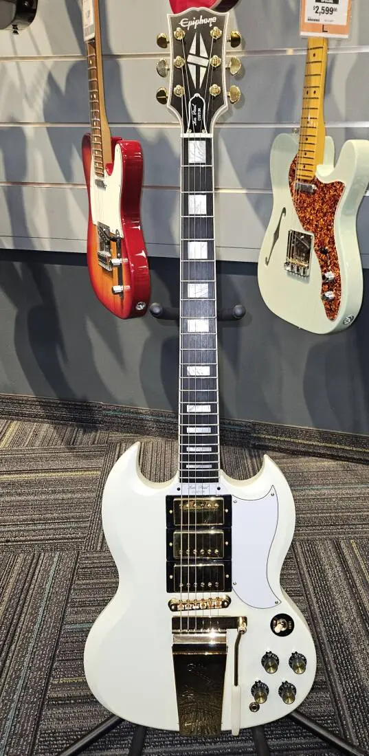 Made in collaberation with the Gibson™ Custom Shop, the Epiphone 1963 Les Paul SG with Maestro Vibrola is a stunning recreation of the classic vintage model. 1963 was the last year that the "Les Paul™" moniker was used on the SG™ Custom and the first year of the maestro™ Vibrola™. The premium appointments the model is known and loved for are all present here, including a one-piece mahogany neck with a long neck tenon, a SlimTaper™ profile and a bound ebony fretboard.