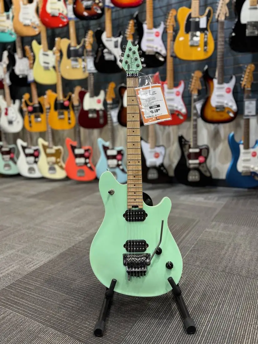 A pair of flagship custom designed black EVH® Wolfgang Alnico 2 humbucking pickups are mounted directly to the body, providing dynamic yet articulate voicing, as well as endless sustain for powerful chords and melody lines. A sturdy and dependable EVH-branded Floyd Rose® locking trem and Floyd Rose locking nut work in tandem for precise tuning even with extreme changes in pitch, while the EVH D-Tuna® retunes to drop-D and back with strict accuracy at the flick of a finger. The volume knob with treble bleed circuit has a 500K EVH Bourns® low friction pot for smooth swells and a tone control knob with a 250K Bourns high friction tone pot that prevents accidental tone shifting. Spotlight-ready, the Wolfgang Special is now available in an all-new Satin Surf Green finish with cream body binding, color matched headstock and chrome hardware.