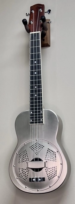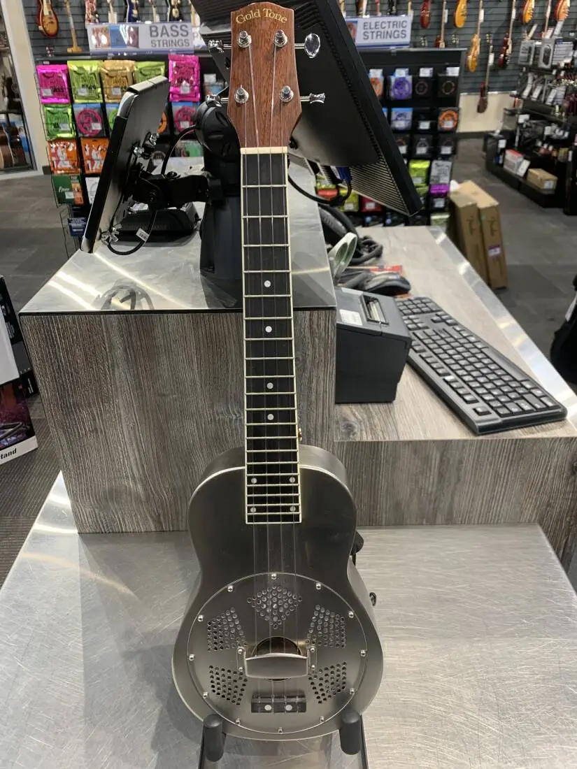 The Gold Tone ResoUke will delight any ukulele player. Its 14.5" concert scale is very comfortable to play, and the ResoUke's tone carries better than that of a wood-bodied uke thanks to its reverse-cone resonator with biscuit bridge, and its resonant steel body. The Gold Tone/Beard resonator coverplate features a removable palm rest, so there's no need to detach the strings and remove the entire coverplate in order to adjust string action, break angle, string spacing or to replace the bridge saddle. The palm rest can also be shimmed to different heights for perfect right hand comfort. The ResoUke also features a bone nut, a Canadian hard rock maple bridge saddle, 14:1 geared Kluson-style tuning machine heads and custom-gauged Aquila Nylgut strings for the best possible tone.