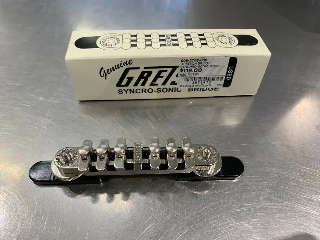 The Synchro-Sonic™ bridge is a top-of-the-line adjustable bridge. A special design created by the masterful Gretsch gurus, it gives you the benefits of both a Space Control™ and a roller bridge!