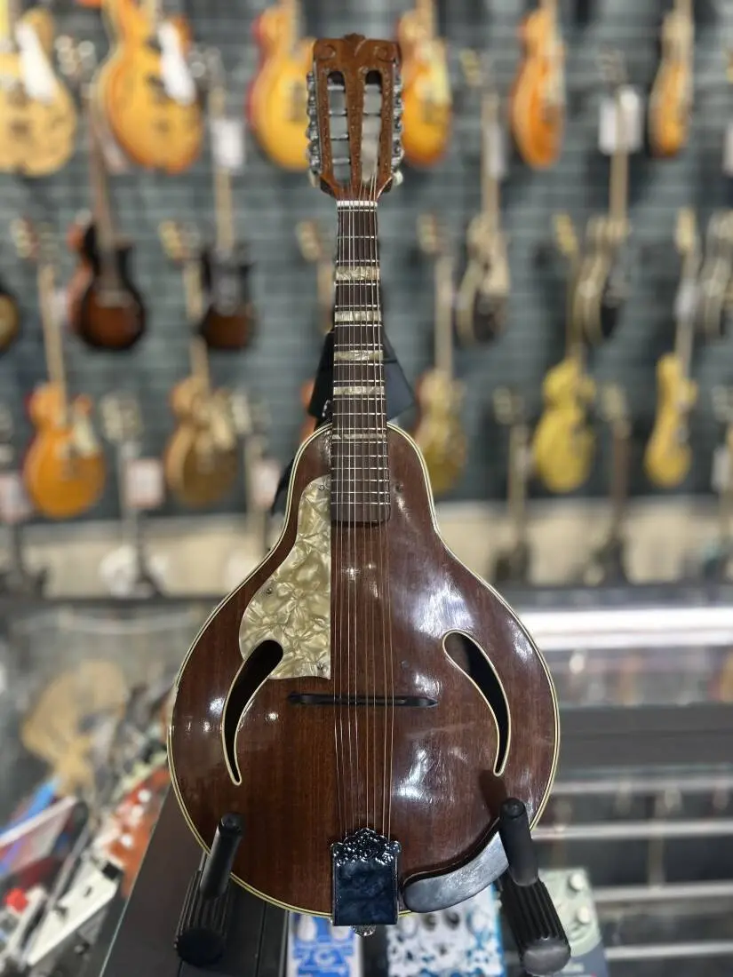 Very cool vintage mandolin converted to be left handed. Symmetrical tear drop-style body, arched mahogany top, arched mahogany back, mahogany sides, two bound cat's-eye soundholes, wide top and back binding, mahogany neck, 17-fret rosewood fingerboard with large block inlays, slotted elaborate headstock with four-per-side open-style tuners, rosewood bridge, trapeze tailpiece, raised pearloid pickguard. Includes hardshell case.