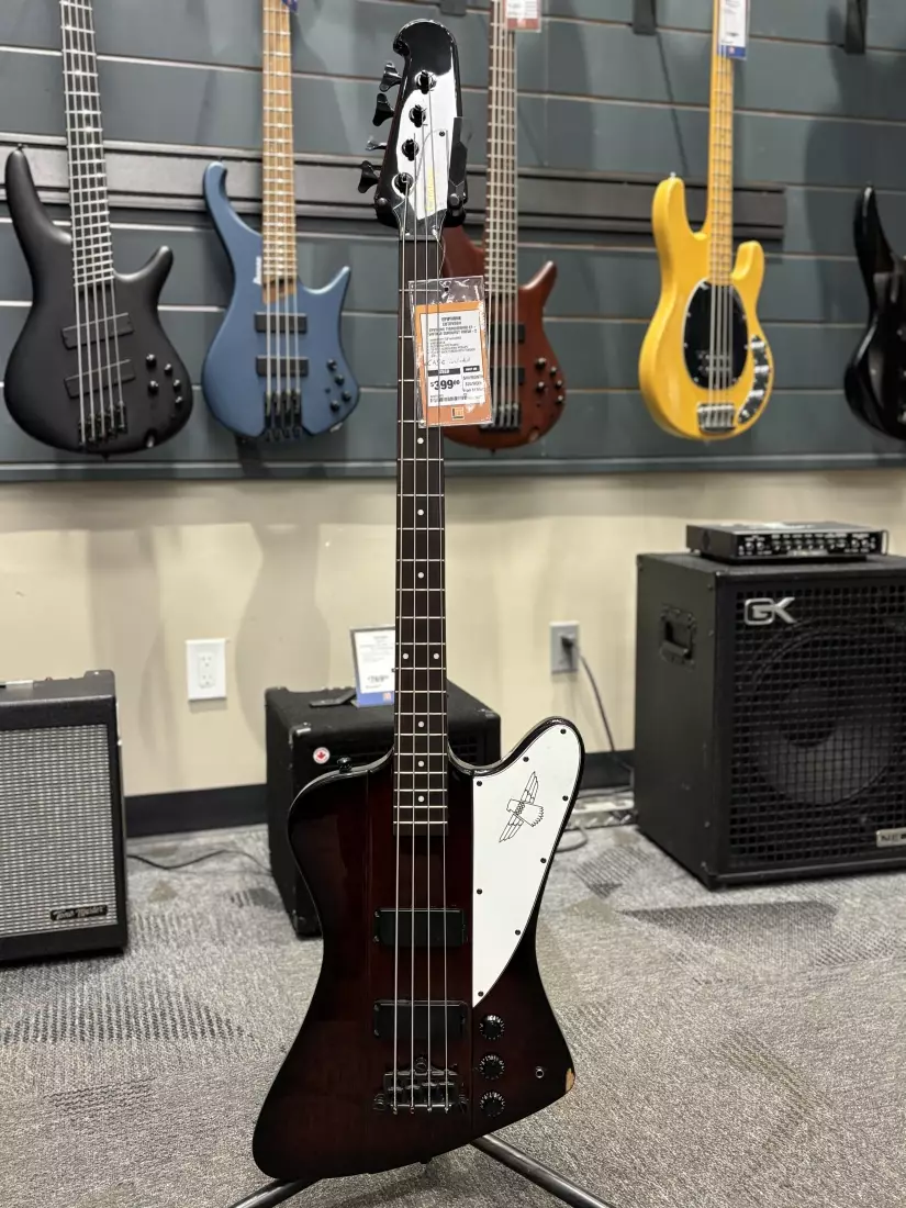 No other bass looks like it or plays like it. The beloved Thunderbird bass from Epiphone features the reverse body styling, carved top and dual bass TB Humbucking pickups complimented with black hardware and the Thunderbird insignia on the pickguard.