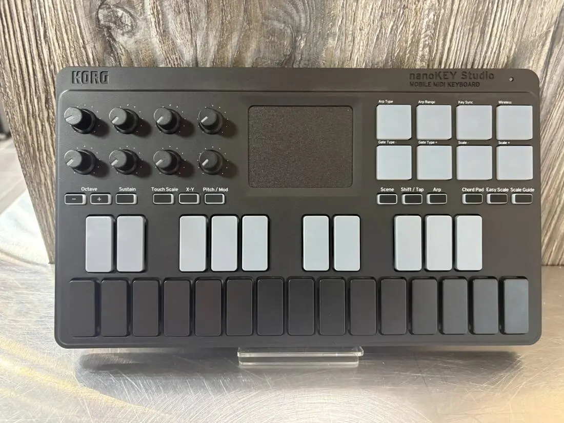 The nanoKEY Studio provides a keyboard, knobs, trigger pads, and touch pad that lets you instantly convert your inspiration into sound. It is battery operated and can connect wirelessly to iPhone/iPad or Mac/Windows. It's a compact, mobile MIDI keyboard that is easy to travel with, allowing ease of use anytime, anywhere.