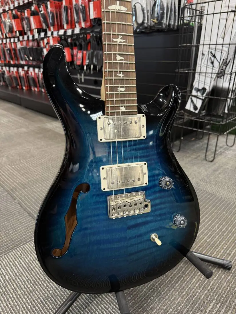 Combining the snap and sustain of a bolt-on guitar with the airy resonance of a semi-hollow body, the CE 24 Semi-Hollow is a truly unique addition to the PRS Bolt-On lineup. The body pairs the traditional combination of a mahogany back and maple top with a bolt-on maple neck and rosewood fretboard. The neck features a Pattern Thin carve and satin nitro finish for a natural, addictive feel. The electronics consist of a volume and push/pull tone control with a 3-way toggle switch, giving a total of six classic sounds from the PRS 85/15 pickups.