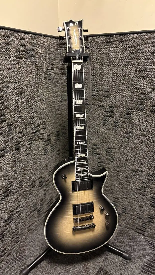 As one of the best-looking, best-sounding, and highest quality single cutaway guitars ever made, the E-II Eclipse is made in Japan at the ESP factory, and designed for serious players who rely on their guitars for professional-caliber stage and studio work. This guitar offers a collection of top-tier components, like a bone nut, Schaller Straplocks, Gotoh locking tuners, and a Gotoh TOM bridge and tailpiece. Perhaps most impressive is its set of EMG 57TW/66TW set for coil splitting each active pickup with individual push-pull controls on both volume knobs. Built with set-thru construction on a mahogany body and mahogany neck, the latest version of the E-II Eclipse is available in three styles: a Buckeye burl maple top in Blue Natural Fade finish; a flamed maple top in Black Natural Burst; and a maple-capped Snow White Satin finish. All E-II Eclipse models offer high-end design features like multi-binding on the body, neck, and matching headstock.