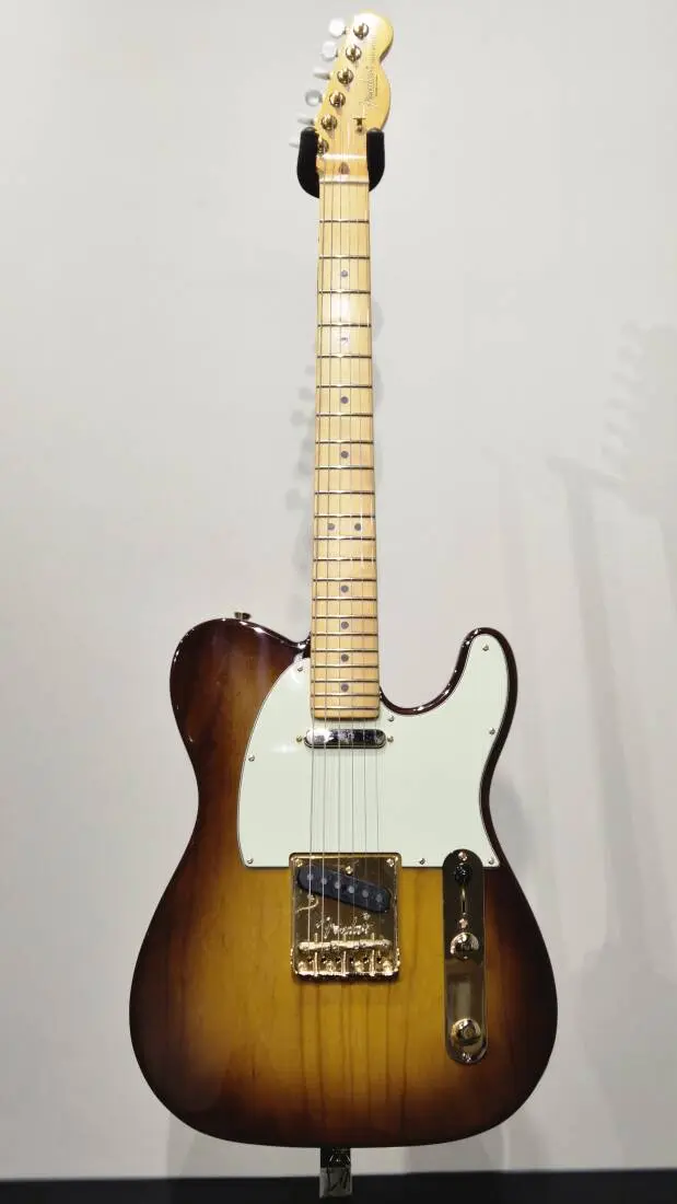 The 75th Anniversary Commemorative Telecaster is decked out in a beautiful 2-Color Bourbon Burst finish over ash body, gold hardware and pearl button locking tuners. The one-piece maple neck features a Deep "C" profile, rolled fingerboard edges, a "Super-Natural" satin finish and a sculpted neck heel for unsurpassed comfort and playability. Custom Shop Twisted Tele pickups deliver searing Telecaster twang with sparkle and clarity. A top-load/string- through bridge with compensated "bullet" saddles provides superb intonation and versatility. Finally, every Commemorative Telecaster features special badging with a 75th anniversary ingot inlaid into the back of the headstock and an engraved anniversary neck plate.
