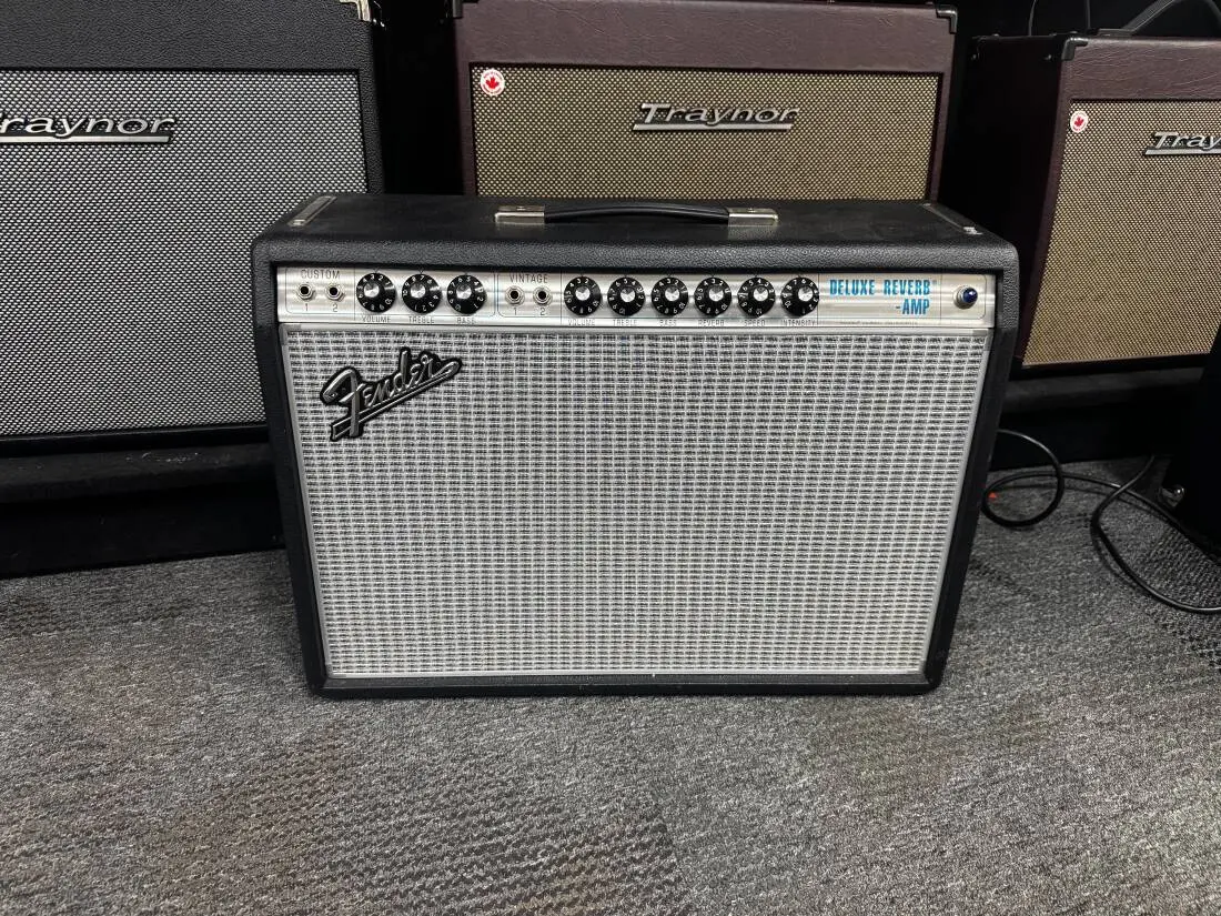 Unique Features: Modified Deluxe Reverb all-tube circuitry, shared reverb and tremolo on both channels, Vintage channel for traditional silverface operation, modified Custom channel with Bassman tone stack, reduced negative feedback for greater touch sensitivity, hand-wired tube sockets, custom-made Schumacher transformers (like the originals), genuine Fender tube-driven spring reverb, genuine Fender tube-driven tremolo (vibrato), 1968-style Silverface aluminum trim around silver-turquoise grille cloth, fitted amplifier cover included, five-year warranty (United States and Canada; other territories may vary).