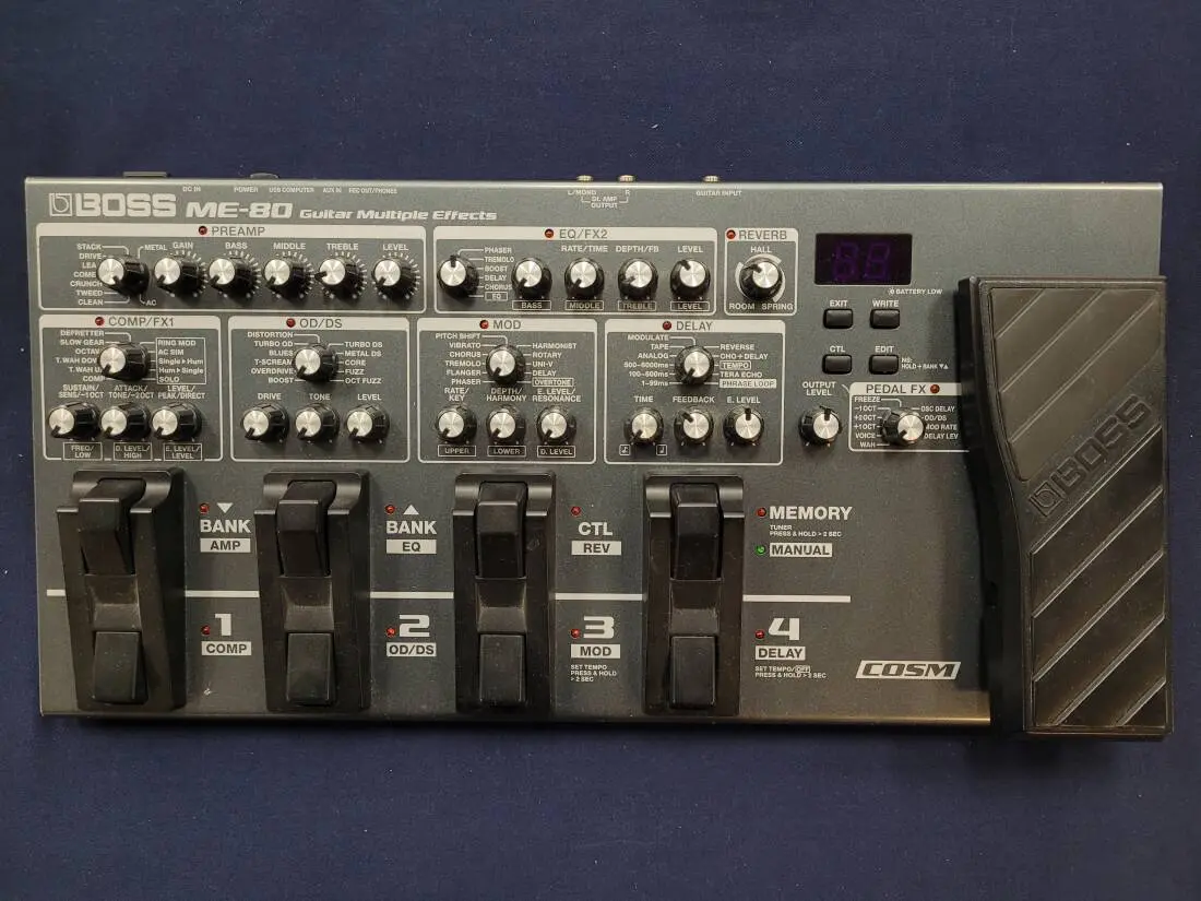 No matter what style you play, its easy to craft your own personal sound with the ME-80s wide range of built-in effects. A complete history of gig-ready BOSS tone processing is at your command, from multiple overdrives and distortions to wahs, mod effects, pitch shifters, delays, and beyond. BOSS groundbreaking Multi Dimensional Processing (MDP) technology is represented with the unique, spacious ambience of Tera Echo and the distinctive tone-shaping possibilities of Overtone. Updated COSM preamps include new additions such as Crunch and Metal, plus an AC preamp designed for acoustic/electric guitar. The onboard expression pedal can be used for foot volume and pedal effects like wah, octave shift, and Freeze, and its also possible to control effects parameters such as mod rate, delay oscillation, and more for expressive real-time sound shaping.