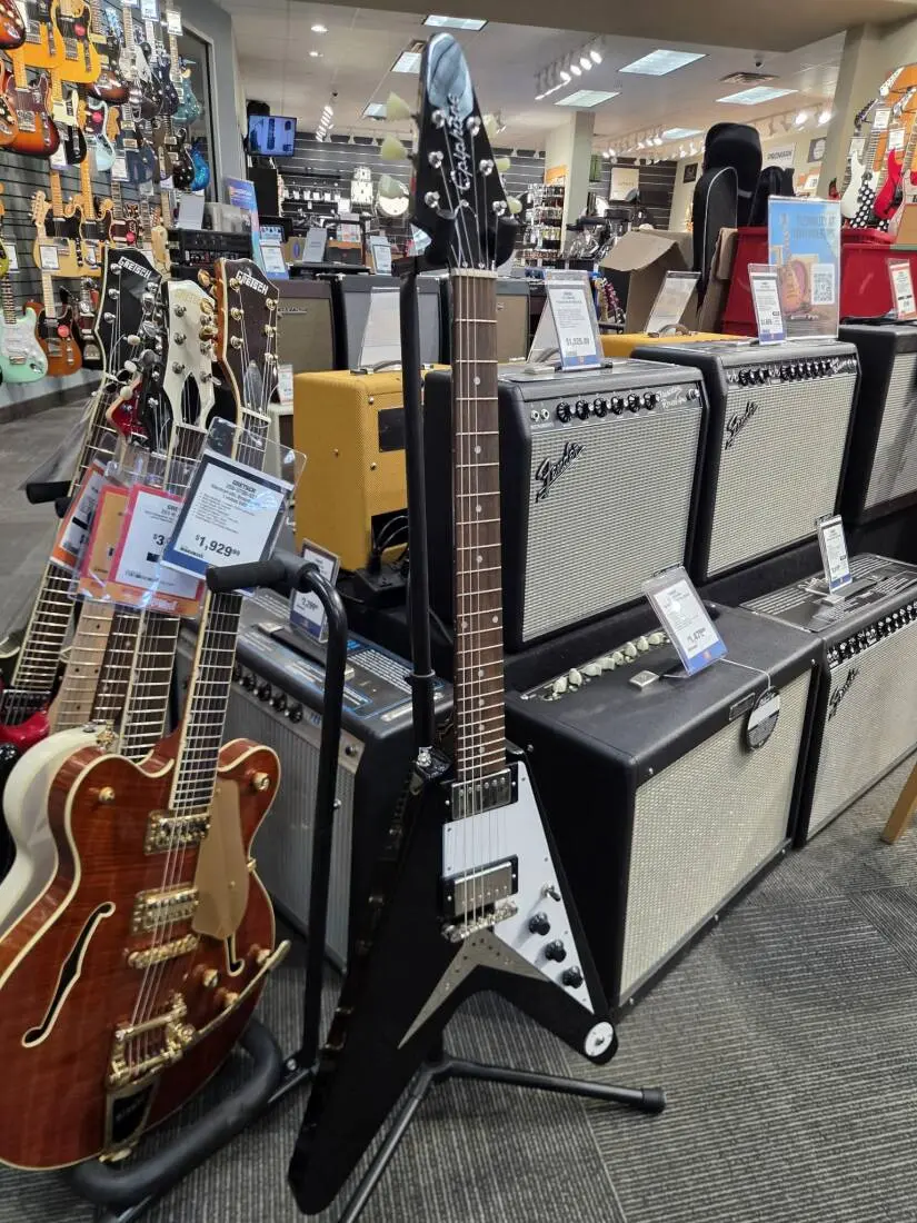 The Epiphone Flying V from the new Inspired by Gibson collection recreates the ultrarare 1958 classic with an Ebony finish, ProBucker™ humbuckers with CTS electronics, a Flying V string- thru tailpiece, and Epiphone Vintage Deluxe tuners.