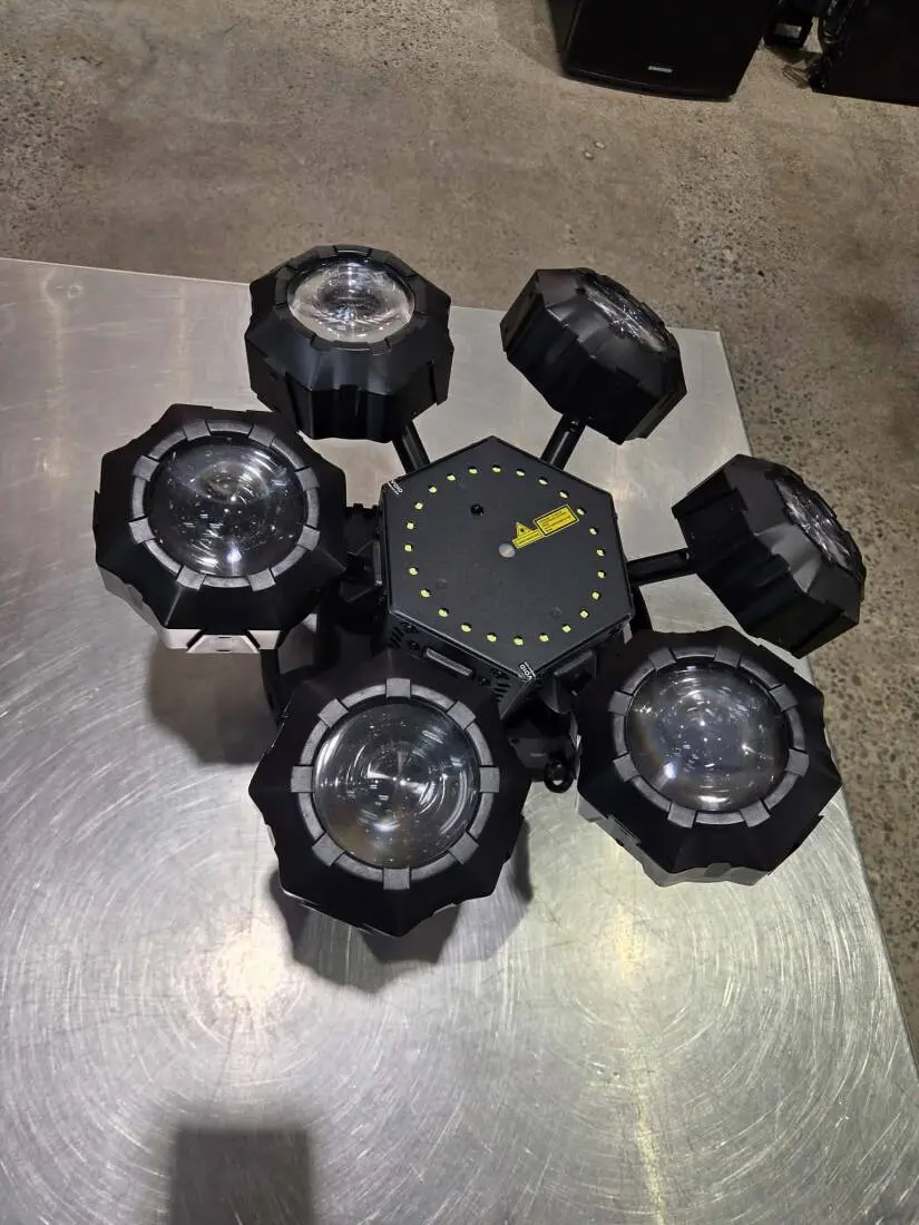 Highlights * A multi-effect light that includes adjustable RGBW beams, a round SMD strobe and a red/green pattern laser on a rotating base
