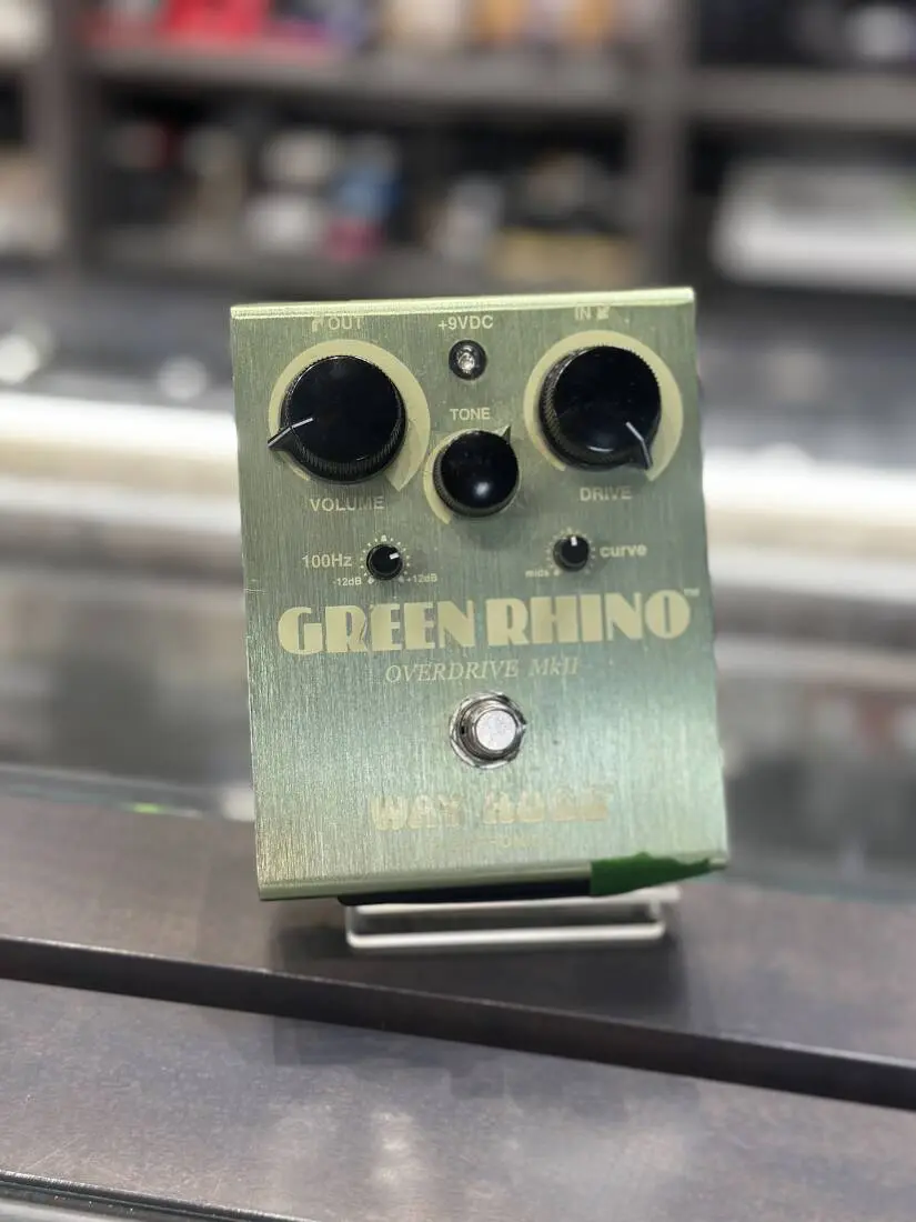 The legendary Way Huge Green Rhino has returned! The Mk II has all the gorgeous classic overdrive that you crave but it has evolved to include cool new features that make it even more rhinoceriffic. In addition to the Volume, Tone, and Drive controls, you get a 100Hz EQ knob to cut or boost your low end by 12dB. Your low notes can either shake the ground like a stampede across the savannah or cut through the mix like a charging rhinos horn. This pachyderm of a pedal also sports a Curve control to fine-tune the corner frequencies of your tone. All this amazing tone shaping makes other overdrives seem boring and one-dimensional by comparison. In front of a clean amp, with the Volume and Drive set at noon, you can go from pristine purity to a punchy, dynamic rhythm tone. Set the Drive low and crank the Volume and add tons of boost to wallop the input of any amp. Turn up the Drive control with the Rhino in front of a distorted channel and hear more gain and sustain than you ever thought your amp was capable of. And no matter how you use it, the Green Rhino Mk II will deliver clean operation, quiet relay-based true-bypass switching, and the rock-solid construction that Way Huge is famous for.