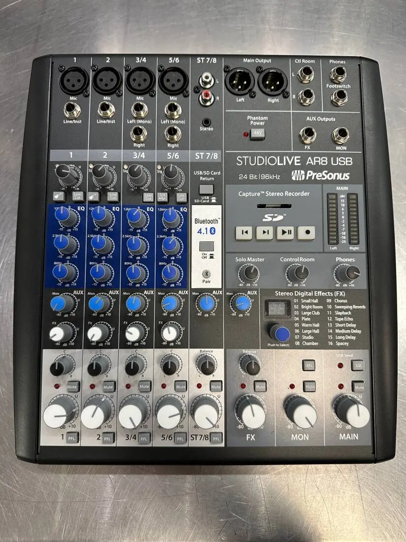 StudioLive AR8 USB 8-channel hybrid mixers make it simple to mix and record live shows, studio productions, band rehearsals, podcasts, and much more. This is a musicians mixer: lightweight, versatile, feature-rich, and packed with analog connections and digital tools, yet easy to learn and use. Create multitrack recordings and fly in backing tracks with a 24-bit, 96 kHz, USB 2.0 digital audio interface. Record and playback in stereo with the integrated SD digital recorder. Stream program music wirelessly, using onboard Bluetooth. Compact and road-ready, StudioLive AR mixers provide a superior all-in-one solution for mixing and recording your performances.