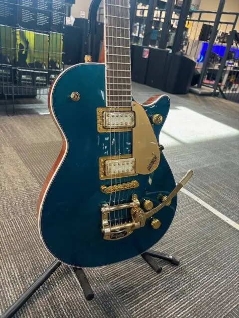 Clean, elegant and powerful, Gretsch's Limited Edition Electromatic Pristine Jet guitars deliver uncompromising Gretsch power and fidelity in stunning style. Two-tone finishes with metallic tops and rich stained bodies and necks, gold hardware and FT-5E Filter'Tron pickups with cream inserts present a sleek, simple opulence that is sure to turn heads.