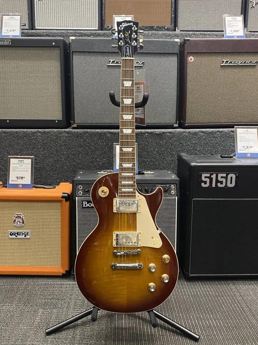 The new Les Paul Standard returns to the classic design that made it relevant, played and loved - shaping sound across generations and genres of music. It pays tribute to Gibson's Golden Era of innovation and brings authenticity back to life. The Les Paul Standard 60's has a solid mahogany body with an AA figured maple top, and a slim taper 60's-style mahogany neck with a rosewood fingerboard and trapezoid inlays. It's equipped with a classic-style Tune-O-Matic bridge, aluminum stop bar tailpiece, Grover Rotomatic "Kidney" tuners, and gold top hat knobs with silver reflectors. The Burstbucker 61R (neck) Burstbucker 61T (bridge) pickups are loaded with AlNiCo V magnets, audio taper potentiometers and orange drop capacitors.